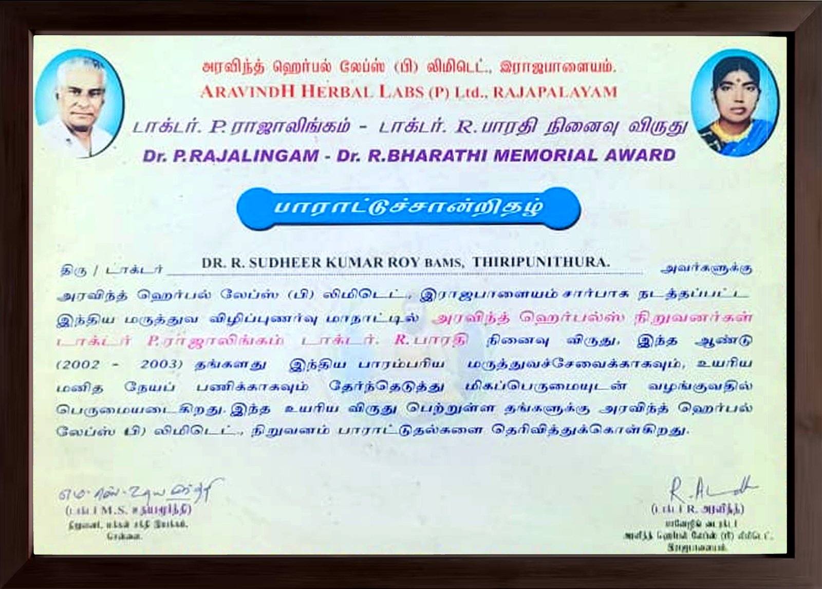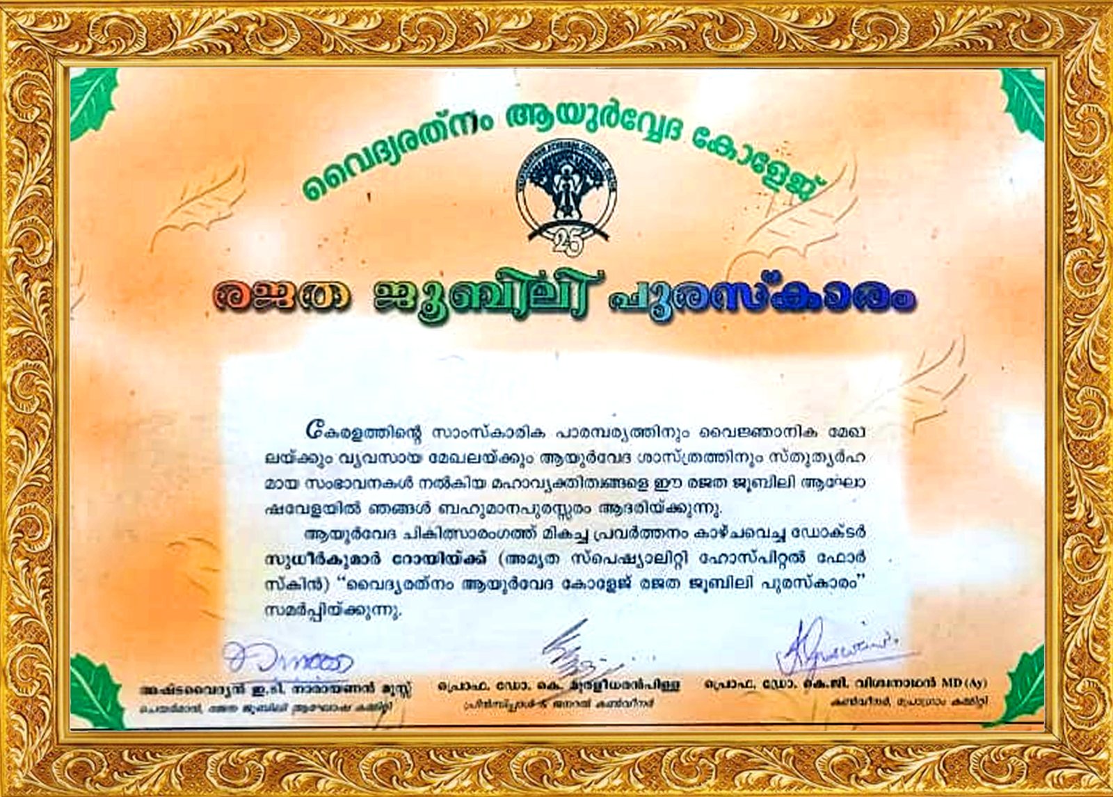 Vaidyaratnam Rajatha Jubilee Award from Vaidyaratnam Ayurveda College, Ollur, Thrissur
